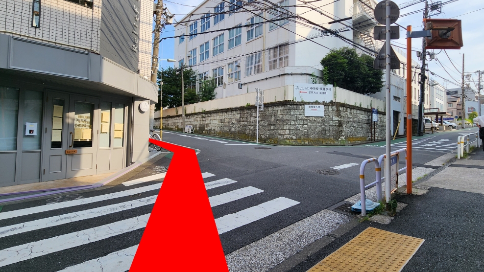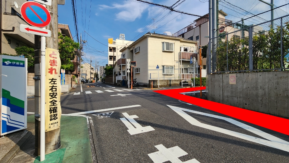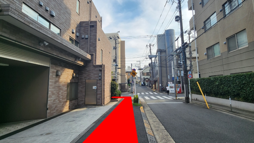 山手通りを渋谷方向に進行後、かむろ坂下信号を入り、2ッ目信号左折