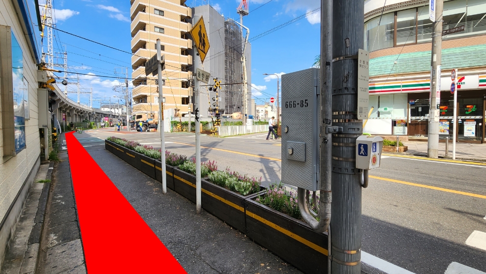 町屋郵便局前交差点を渡る
